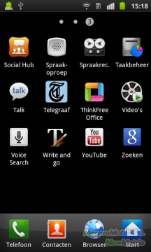 Net als bij de homescreens kun je zien op welke pagina je bent aan de bolletjes bovenaan het scherm. De apps zijn op op alfabet gerangschikt, maar nieuwe apps die je uit de Android Market haalt worden achteraan de lijst geplaatst. Het is wel mogelijk om de apps in een andere volgorde te zetten. Druk hiervoor in de menu-weergave op de menu-knop, en kies dan voor bewerken. Behalve de menu-volgorde, kun je dan ook instellen welke apps je in het dock wilt zien.