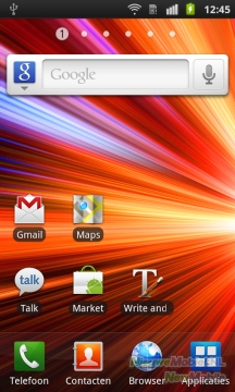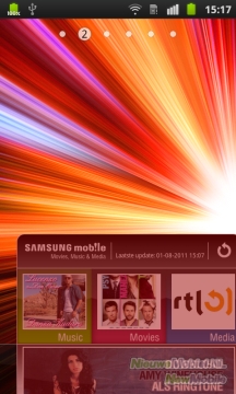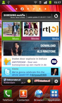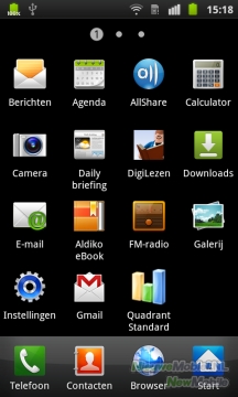 Zoals je gewend bent van toestellen die op Android van Google draaien, heb je meerdere homescreens tot je beschikking. Dit zijn er standaard zeven, maar dat aantal is ook naar beneden aan te passen. Meer dan zeven homescreens is dus niet mogelijk, maar lijkt ons ook overbodig. Anders dan bij de meeste anders Android-toestellen, is niet het middelste homescreen het start-scherm, maar de meest linker. Dit alles is het gevolg van de TouchWiz-interface, Samsungs eigen Android-skin. Deze onderscheidt zich van andere Android-skins door kleurrijke icoontjes. Het is net waar je van houdt. Sommigen zullen de kleuren van Samsung mooi vinden, anderen vallen voor de strakkere icoontjes van HTC Sense.