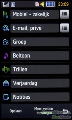 Er kan zeer veel informatie per contactpersoon opgeslagen worden. In eerste instantie kunnen er elf velden ingevuld worden die variëren van e-mail adressen tot aan specifieke beltonen. Wanneer je drukt op meer velden toevoegen komen daar nog eens 19 velden bij die wat meer zakelijk gericht zijn met velden als functie en zakelijk adres.