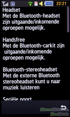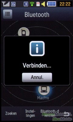 De Bluetooth van de Jet is zeer uitvoerig en ondersteunt een reeks van de meest voorkomende protocollen. Een aantal voorbeelden zijn de stereo headset, handsfree en een seriële poort voor gegevensoverdracht. Het daadwerkelijk versturen van een bestand is ons helaas niet gelukt. Wanneer we iets wilden sturen kregen we meteen een voortgangsbalk te zien, maar dan na even wachten telkens weer de boodschap dat het mislukt was. Het Bluetooth menu is op de Jet helaas dusdanig beperkt dat we er niet verder mee kwamen. Ook verbinding maken via de PC wilde niet lukken. We vrezen dat het enkel goed kan werken wanneer er eerst het softwarepakket geïnstalleerd wordt.