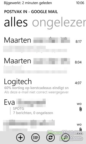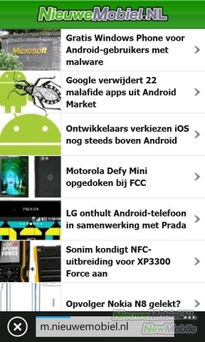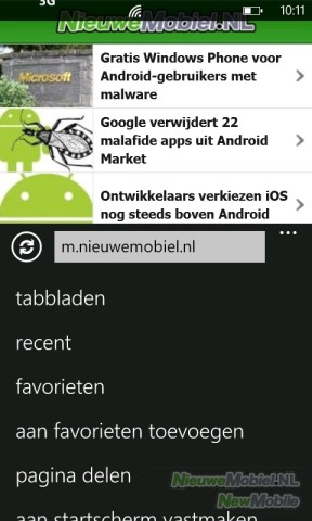 Dan is er nog de browser. Met een naam als Internet Explorer zal deze bij mensen gemengde reacties en verwachtingen oproepen. Dat is gelukkig in het geval van Windows Phone niet helemaal terecht want hij functioneert ruimschoots naar behoren. Leuk detail is de adresbalk onderaan het scherm. Dichtbij je duim en de andere functies. De browser komt enigszins traag over maar laad sites wel naar behoren. Al moeten we het doen zonder Flash. Wat betreft zoomen scoort de browser slecht. Na dubbel tikken probeert hij het wel maar soms keert het beeld dan toch weer terug naar zijn oude afmetingen. Met pinchen gaat het wel snel en soepel maar wordt tekst niet automatisch passend gemaakt aan het beeld.