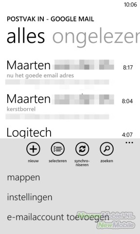 De omgang met e-mail is uitstekend verzorgd op de Omnia W. Behalve van Windows Live kunnen ook accounts van Outlook, Yahoo! Mail, Google, POP en IMAP snel ingevoerd worden. Elk e-mailaccount krijgt standaard zijn eigen tegels op het startscherm maar accounts kunnen ook gekoppeld worden waarna ze onder één tegel gegroepeerd worden. In ieder geval voor Hotmail en Google geld dat berichten naar het toestel gepusht kunnen worden en ook zelfaangemaakte mappen worden gesynchroniseerd. Het toestel kan met alle mogelijke berichten overweg en alles wordt dan ook netjes weergegeven.