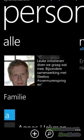 In het telefoonboek is als eerste je eigen profielafbeelding te zien als snelkoppeling naar jouw profiel. Onder deze afbeelding staat de lijst met contactpersonen. Door op de eerste letter van het alfabet te drukken kan snel naar de gewenste contactpersoon gesprongen worden. Door naar rechts te slepen komt een overzicht in beeld met de laatste updates van contactpersonen uit gekoppelde accounts. Daar weer naast vinden we een klein overzichtje van de laatst bekeken en gebruikte contactpersonen.