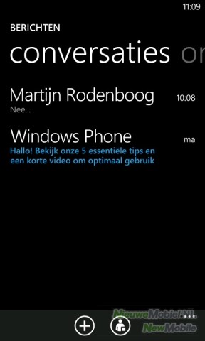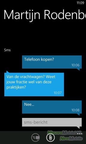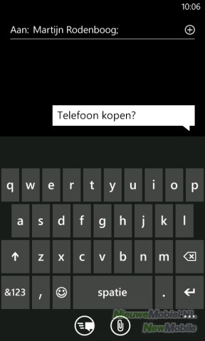 Het typen van al dit berichtengeweld moet gebeuren via het virtuele toetsenbord van Windows Phone. Dat is gelukkig een behoorlijk gebruiksvriendelijke bezigheid. Het toetsenbord heeft een overzichtelijke lay-out en de toetsen zijn ruim van opzet. Wel is het jammer dat zelfs voor cijfers en de meest gebruikte leestekens eerst de functie van de toetsen gewijzigd moet worden. Ook aan spellingcontrole en een woordenboek is gedacht, al zouden deze nog wel een tikkeltje intelligenter mogen. Wees erop bedacht dat het automatisch wijzigen van een woord vrijwel geruisloos gebeurd en je dus zeker in het begin ongebruikelijke woorden zelf zal moeten toevoegen aan het woordenboek.