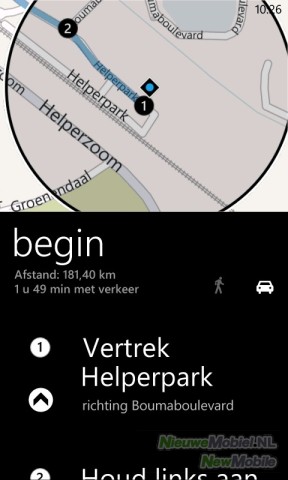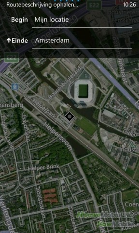 Bing maps of, zoals het in het Nederlands heet, kaarten maakt hier natuurlijk vooral gebruik van en onze positie was inderdaad erg snel vastgesteld. Met dit programma kan een routebeschrijving opgesteld worden die bij elke richtingverandering een aanwijzing geeft. Maar alleen met behulp van een platte kaart en in de vorm van tekst, niet door gesproken aanwijzingen.
