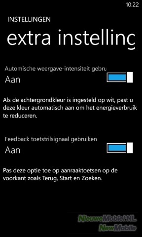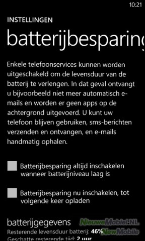 Het mooie van Windows Phone is dat onder het kopje batterijbesparing in de instellingen is te vinden hoe lang het toestel al van de lader is en wat de resterende tijd bedraagt op de huidige acculading. De batterijbesparing kan automatisch ingeschakeld worden wanneer het batterijniveau laag is maar jammer genoeg is dit niveau niet in te stellen en is niet duidelijk welke toepassingen dan afgeknepen worden.