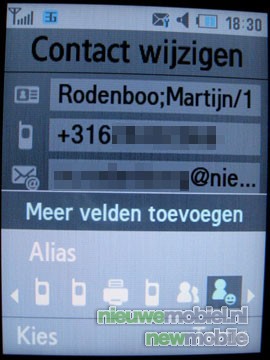 De telefoon biedt twee mogelijkheden voor het opslaan van contacten. De eerste is de meest beperkte, namelijk op de SIM kaart. Hierbij kan er slechts één nummer opgeslagen worden. Bij direct opslaan op de telefoon zijn de mogelijkheden aanzienlijk uitgebreider. Er is dan de mogelijkheid voor het toevoegen van een e-mail adres, een tweede telefoon nummer, afbeelding, ringtone, notities en een groep. Wanneer je echter klikt op opties en meer velden toevoegen kunnen er tot wel 21 extra opties weergegeven worden, variërend van bijnaam tot internetadres. Met een maximaal aantal van 1000 nummers zal de telefoon voor de meeste gebruikers meer dan voldoende opslagmogelijkheden hebben. Er is geen mogelijkheid tot voice dialing maar de telefoon kent echter wel de ouderwetse speed-dial.