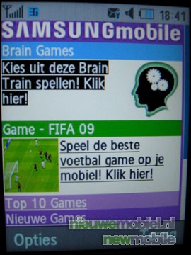 Het aanbod van games is erg teleurstellend. Hoewel ze apart zijn opgenomen in het extra’s menu, bevat het gedeelte niets meer dan een link naar een mobiele website van Samsung. De indruk dat het toestel over spellen bevat is dus vals.