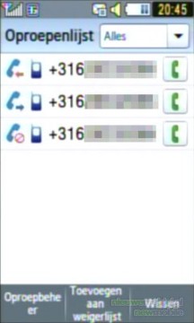 De oproepenlijst kan geopend worden met de nummerkeuzetoets of via menu. Hier kunnen oproepen gesorteerd worden onder alles, gemist, uitgaand of ontvangen. In het oproepbeheer zitten een gegevensteller en een overzicht van de gespreksduur van de gekozen en ontvangen oproepen.