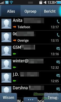 Er zijn heel wat manieren om een gesprek te starten. Het kan natuurlijk via de contactenlijst maar ook een favorietenwidget, de toetsenbordfunctie en het logboek behoren tot de opties. Overal waar een lijst met contactpersonen te zien is, kan door van rechts naar links over de naam te slepen een oproep gestart worden. Door de andere kant op te slepen kan een bericht opgesteld worden.