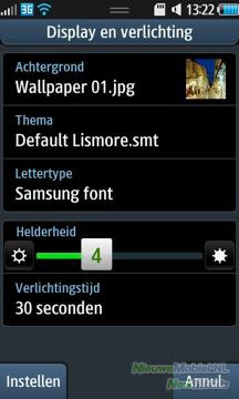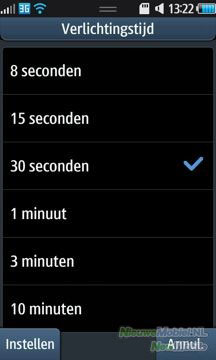 De schermhelderheid staat standaard ingesteld op 40%. Een enkele keer hebben we dit ook naar 60% procent gezet maar na opnieuw opstarten van het toestel staat dit weer op 40% en meestal lieten we het daar maar gewoon op staan. Verder kan alleen de verlichtingstijd nog ingesteld worden. Het scherm is wel wat aan de smalle kant.