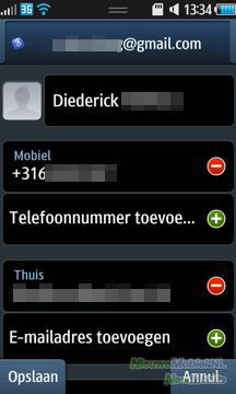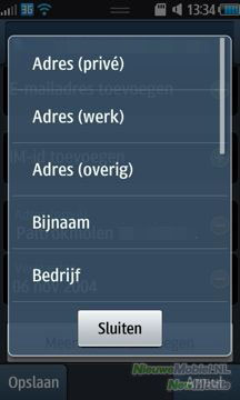 Voor een nieuw contact kunnen telefoonnummer, e-mailadres, IM-id, groep en beltoon meteen ingevuld worden. Voor extra velden kan onder andere gekozen worden voor meerdere adressen, werkgegevens en familiegegevens.