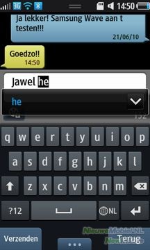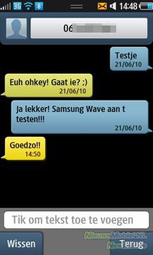 Een bericht opstellen kan in de verticale stand met een numeriek of QWERTY toetsenbord maar ook met handschriftherkenning. Hoewel het toetsenbord van de Wave in de verticale stand erg krap lijkt gaat typen erg fijn en typefouten komen nauwelijks voor. In de horizontale stand is de spatiebalk erg klein en kan een bericht makkelijk per ongeluk verzonden worden door de plaatsing van de verzendentoets. Tekstvoorspelling kan ingeschakeld worden maar de werking daarvan is bedroevend. Tijdens het typen kan je namelijk alleen kiezen uit woorden in het woordenboek en als datgene dat je hebt ingetypt daar niet instaat kan je het niet selecteren. Het is ook jammer dat de punt en komma niet bij de letters op het toetsenbord staan maar bij de leestekens. Dit maakt snel typen een stuk lastiger.