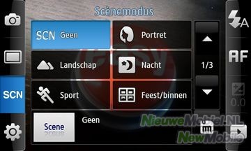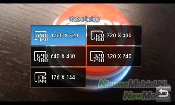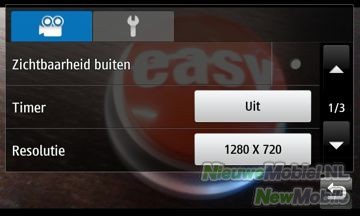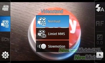 In de videomodus kunnen in het zoekvenster videostand en flitser ingesteld worden. Voor videostand kan gekozen worden uit normaal, limiet MMS en slowmotion. Bij uitgebreide instellingen zijn de opties zichtbaarheid, timer, resolutie, witbalans, effecten, videokwaliteit, contrast, intensiteit, scherpte, richtlijnen, geluidsopname en opslag.