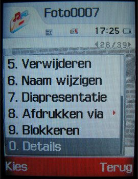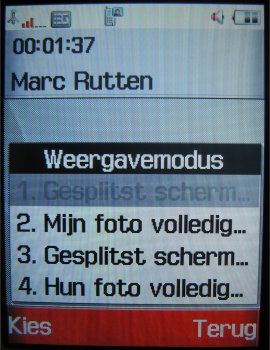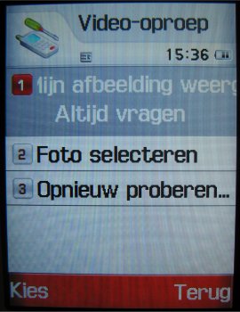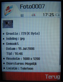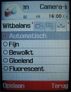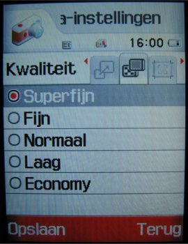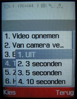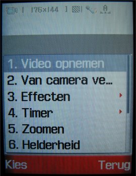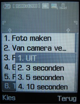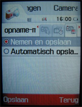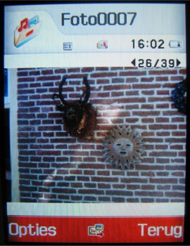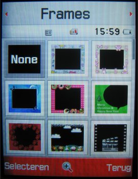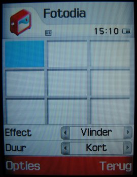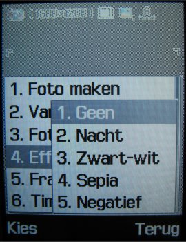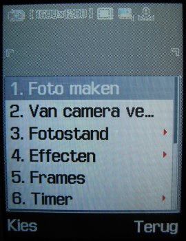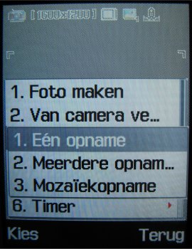 Naast deze instellingen is het mogelijk om uit drie fotostanden te kiezen, namelijk: Eén opname, Multishot (keuze uit: 6 foto’s kwaliteit normaal, 6 foto’s kwaliteit hoog, 9 foto’s kwaliteit normaal, 9 foto’s kwaliteit hoog, 15 foto’s kwaliteit normaal of 15 foto’s kwaliteit hoog) en Mozaïek opname. Naast deze opties kan men tijdens het maken van een foto inzoomen, de helderheid in zeven stappen instellen, de foto horizontaal en verticaal omflippen en de flitser gebruiken. Verder zijn er in totaal vier effecten, namelijk: Nacht, Zwart/wit, Sepia en Negatief. Als laatste zijn er in de camera functie een zelfontspanner (keuze uit: Uit, 3 seconden, 5 seconden, 10 seconden) en mogelijkheid tot het toevoegen van één van de 30 kaders toegevoegd. Helaas kan men niet alle opties gebruiken bij alle resoluties. Zoomen gaat helaas niet bij alle resoluties en kaders worden alleen gebruikt bij een resolutie van 176 x 144 pixels.