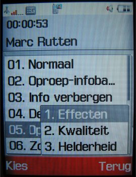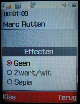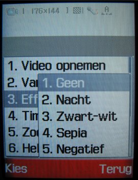 Naast deze instellingen is het mogelijk tijdens de video in te zoomen, de helderheid in zeven stappen in te stellen en de video horizontaal of verticaal om te flippen. Verder zijn er in vier effecten, namelijk: Nacht, Zwart/wit, Sepia en Negatief. Als laatste is er in de videocamera functie een zelfontspanner (keuze uit: Uit, 3 seconden, 5 seconden, 10 seconden).
