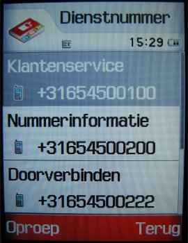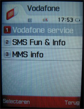 Het laatste onderdeel is het Vodafone diensten onderdeel dat ook voor een deel terug komt bij het telefoonboek. In het telefoonboek komt alleen het gedeelte qua provider telefoonnummers terug. Het andere deel met informatie over de provider vindt men onder toepassingen terug.