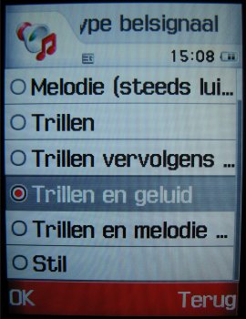 De trilfunctie van het toestel voelt men goed door een jas heen en is uitermate sterk. Via het menu instellingen en geluidsinstellingen kan men zelf instellen hoe en wanneer de trilfunctie aangezet kan worden. Het is nu mogelijk door de toepassing van profielen - Ja, men hoort het goed. Er zijn profielen aanwezig in de Z400V – ook trillen en bellen tegelijk in te stellen. In de profielen kan men een keuze maken uit een groot aantal instellingen. Helaas is het nog niet mogelijk om voor bepaalde soorten berichten (SMS, MMS of mail) een berichttoon in te stellen. Maar alle andere opties zijn aanwezig. Een enorme verbetering met andere Samsung modellen.