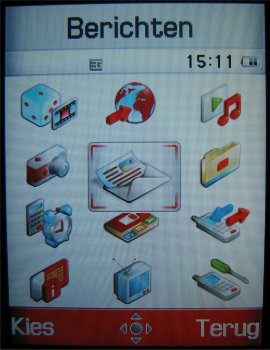 Via de twee oplichtende soft-keys kan men in het onderste gedeelte van het scherm twee opties aanklikken. Eén van deze opties is het menu binnen gaan. In het menu van de Z400 zijn nu in een raster twaalf geanimeerde icoons zichtbaar die men via de 5-richtings bedieningstoets kan aanklikken.