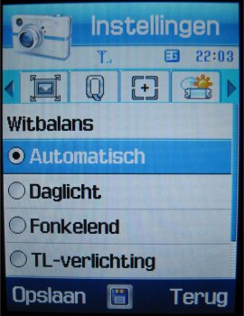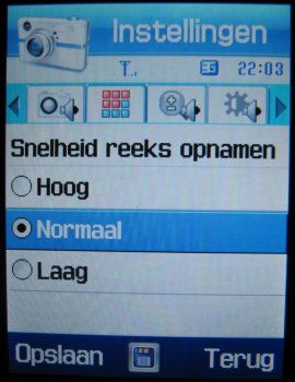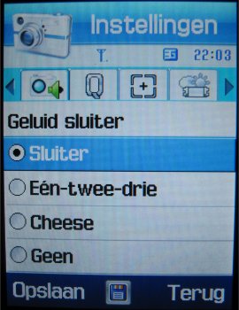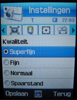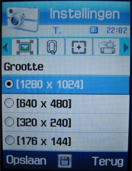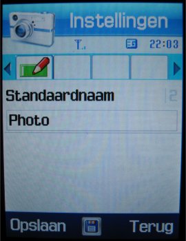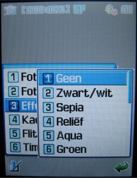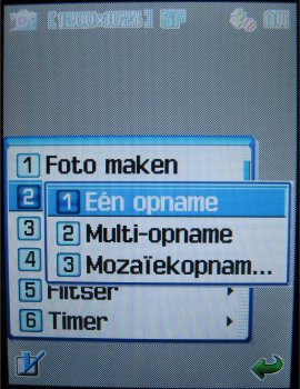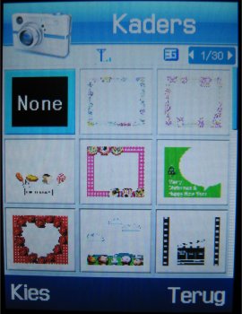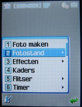 Naast deze instellingen is het mogelijk om uit vier fotostanden te kiezen, namelijk: Eén opname, Multishot (keuze uit: 6 foto's kwaliteit normaal, 6 foto's kwaliteit hoog, 9 foto's kwaliteit normaal, 9 foto's kwaliteit hoog, 15 foto's kwaliteit normaal of 15 foto's kwaliteit hoog) en Mozaïek opname. Naast deze opties kan men tijdens het maken van een foto inzoomen, de helderheid in elf stappen instellen, de foto horizontaal of verticaal omflippen en de witbalans kiezen (Auto, Daglicht, Fonkelend, Tl-verlichting en Bewolkt). Verder zijn er in totaal zeven effecten, namelijk: Zwart/Wit, Sepia, Reliëf, Aqua, Groen, Negatief en Mits. Als laatste zijn er in de camera functie een zelfontspanner (keuze uit: Uit, 3 seconden, 5 seconden, 10 seconden) en mogelijkheid tot het toevoegen van één van de 30 kaders toegevoegd.
