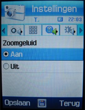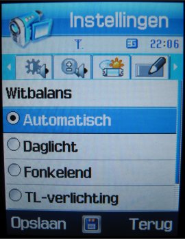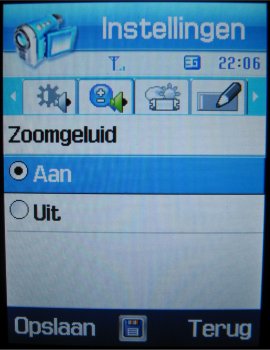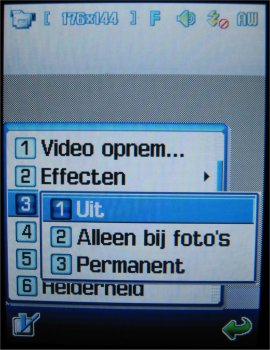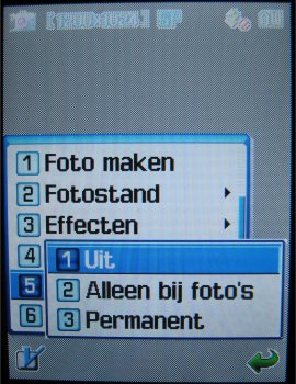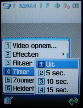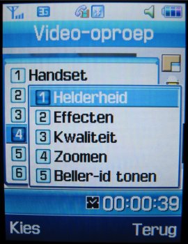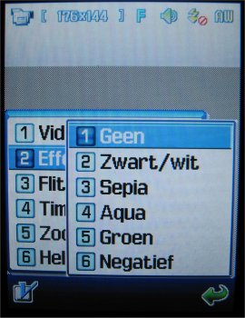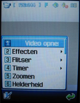 Naast deze instellingen is het mogelijk tijdens de video in te zoomen, de helderheid in zeven stappen in te stellen, de foto horizontaal of verticaal om te flippen en de flitser te gebruiken. Verder zijn er in zeven effecten, namelijk: Zwart/Wit, Sepia, Reliëf, Aqua, Groen, Negatief en Mits. Als laatste is er in de videocamera functie een zelfontspanner (keuze uit: Uit, 3 seconden, 5 seconden, 10 seconden).