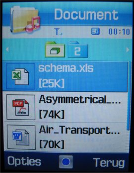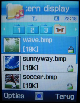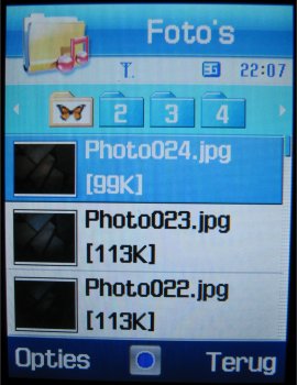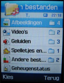 Het derde onderdeel is het bestandsbeheer. Hierin vind men alle data; afbeeldingen, video's, muziek en geluiden, die op het toestel zijn geplaatst. Een aantal onderdelen hieven zijn al besproken bij de camera, maar er zal nog wel moeten worden aangegeven dat wanneer men niet een foto of video wil maken men via dit onderdeel de gemaakte of gedownloade foto's en video's kan bekijken. Samsung had op het geleverde toestel de diverse mappen gevuld met een groot aantal foto, video en audiobestanden. Al deze bestanden kunnen worden bekeken of afgespeeld.