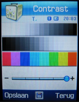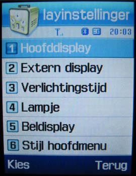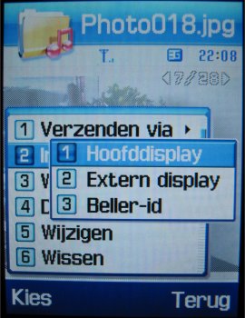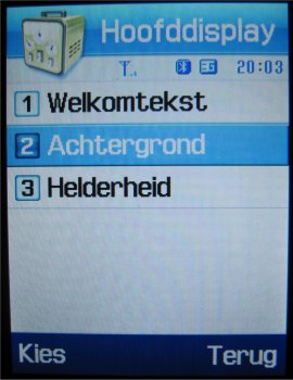 Verder instellingen aan het scherm zijn er amper. Men kan de helderheid instellen in vijf standen. Verder krijgt men de foto van de persoon te zien op het externe scherm wanneer deze belt, kan de MP3 speler gestart en getoond worden en wordt de status weergegeven van een gemist gesprek of ontvangen SMS bericht.