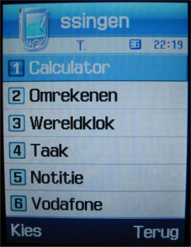 Het vierde en laatste onderdeel bevat het grootste aantal programma's. Dit is namelijk de Toepassingen. Dit onderdeel van het menu bevat Wereldtijd, Alarm, Calculator, Converter, Timer, Stopwatch en het provider onderdeel Vodafone. Elk onderdeel zal hieronder kort uitgewerkt. De mediaspeler en spraakmemo zijn nu onder het onderdeel Multimedia geplaatst in het menu. Ook deze punten zullen hieronder opgepakt worden.