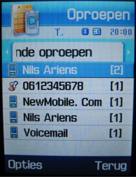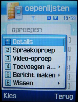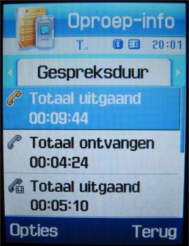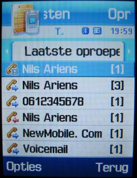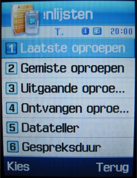 Heeft men na een gesprek de behoefte de gesprekkenlijst te raadplegen dan kan dat via het menu of via de opneemtoets. Via beide opties komt men in het menuonderdeel oproepenlijst. Door de 5-richtings bedieningstoets in vier richtingen te bewegen kan men door het hele menu alle informatie opvragen. Kiest men een oproep dan krijgt men een overzicht van de naam en het nummer van de persoon te zien en daarnaast de datum en tijd van het gesprek. Helaas geen duur van het gesprek. De duur van het gesprek kan alleen opgevraagd worden via de menuoptie, waar ook alleen de tellers gewist kunnen worden.