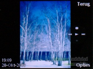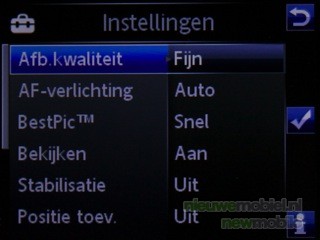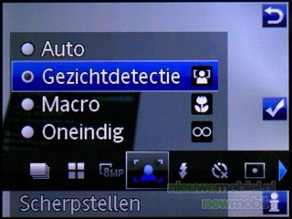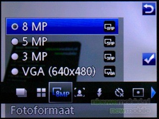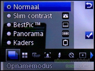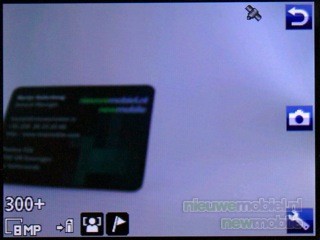 Als de camera is geactiveerd worden de camerafunctietoetsen blauw verlicht. Zo bied de navigatietoets plaats aan vier snelkoppelingen naar, van bovenaf met de klok mee, de belichting, de flitser, zelfontspanner en scherpstelmodus. Naast de oorspeaker zit onder een knop voor opnamemodus en boven voor sceneselectie. De linker selectietoets activeert het instellingenmenu. Foto’s kunnen genomen worden in 8 MP, 5 MP, 3 MP en VGA formaat. De kwaliteit kan op fijn of normaal worden ingesteld. Verder zijn effecten, witbalans en meetmodus nog aan te passen.