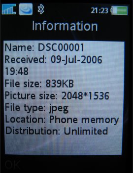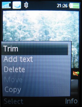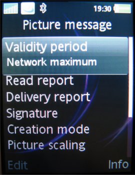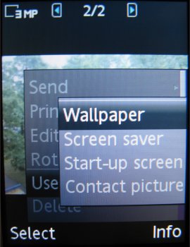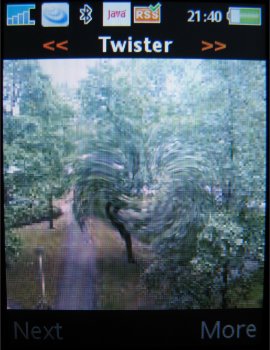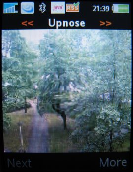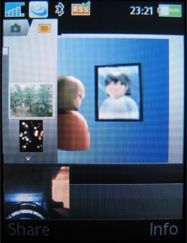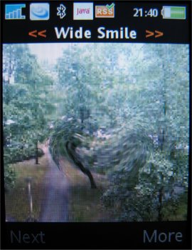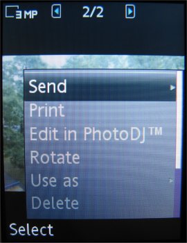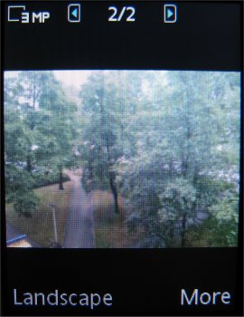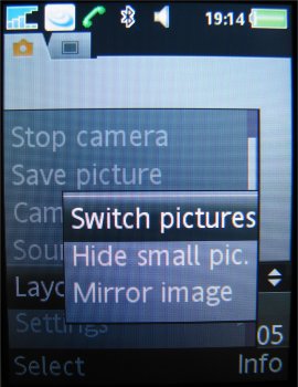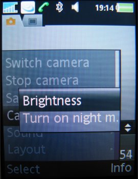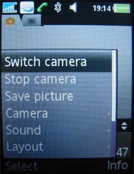 Verdere instellingen in de camera zijn de 16x zoom die men via de volumetoetsen kan instellen, de helderheid die ingesteld wordt door de bedieningstoets naar links of rechts te verplaatsen, de fotomodus (normaal, panaroma, BestPic en kaders), fotoformaat (3 MP 2048 x 1536, 2 MP 1632 x 1224, 1 MP 1280 x 960, VGA 640 x 480 pixels), zelftimer, effecten (Zwart-Wit, Negatief, Sepia en Solariseren), witbalans (Auto, Daglicht, Bewolkt, TL-licht en Fel licht), spotmeter, fotokwaliteit (Normaal en Fijn), keuze uit vier sluitertonen, Tijd- en datumnotatie, Reset bestandsnummer en het gekozen opslagmedium, dus geheugenkaart of intern geheugen.