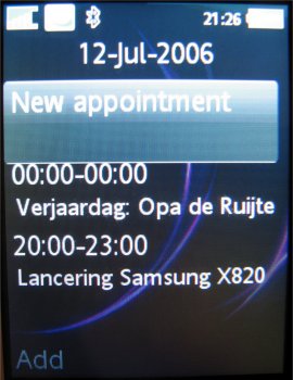 Naast de kalender vindt men onder het onderdeel agenda nog een aantal onderdelen, zoals de wekker, een takenlijst, notitielijst, timer, stopwatch, rekenmachine en codememo. De voicememo vind men onder het onderdeel Entertainment. Al deze functies mogen als logisch en bekend mogen worden beschouwd.