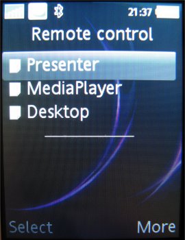 Externe besturing is een onderdeel in het menu waarmee men een PC of laptop kan besturen. Het gaat hier om drie verschillende opties genaamd: Presenter, Media player en Desktop. Door het toestel aan een PC of laptop te verbinden via een Bluetooth verbinding wordt het programma gestart. Presenter maakt van het toestel een draadloze afstandsbediening die men tijdens het presenteren kan gebruiken. Media player is bedoeld om de muziek speler in de PC te bedienen en de laatste optie genaamd Desktop geeft de mogelijkheid programma’s te starten op de PC. Alle drie de opties genereren eigen functies achter de toetsen op het toetsenbord corresponderend met de gekozen optie. De centrale joystick neemt de bewegingsfuncties van de muis over.