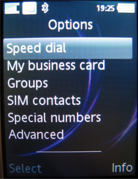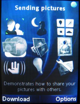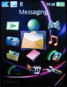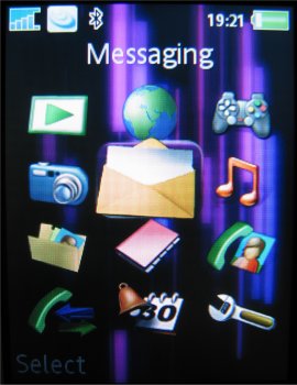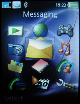 Het hoofdmenu bestaat uit twaalf iconen, verdeeld over vier rijen van elk drie stuks. Elk icoon vertegenwoordigt een bepaalde functie of groep functies, zoals Camera, Berichten, Telefoonboek, Agenda en Bestandsbeheer. Met de bedieningstoets kan eenvoudig en snel door het menu worden genavigeerd. Hierbij wordt duidelijk en op fraaie wijze in beeld gebracht waar men zich bevindt en in welke richting bewogen wordt: bij elke druk verschuift een soort 'spotlight' van icoon naar icoon. Het icoon waarheen bewogen wordt verandert op dat moment van vorm en wordt groter. Selecteren gaat via het indrukken van de bedieningstoets of een druk op de linker soft key.