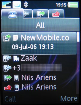 Vanuit de standby-stand geeft de linker softkey (Gesprek) toegang tot het complete gespreksoverzicht. Uit dit scherm blijkt duidelijk de aangepaste gebruikersinterface waarbij tabbladen worden gebruikt. Het gebruik van dergelijke tabbladen is niet nieuw; in oudere Ericsson modellen kwamen ze ook al voor. Het gespreksoverzicht bestaat uit vier bladen: Alle, Uitgaand, Beantwoord en Gemist. Alle gesprekken die met de K800i zijn gevoerd worden hier gerubriceerd weergegeven. Overige gegevens met betrekking tot gesprekken zijn terug te vinden onder het icoon Instellingen op het tabblad Gesprekken. Hier zijn diverse tellers geplaatst; naast duur en kosten van de gesprekken worden hier het aantal verzonden SMS- en MMS-berichten en de hoeveelheid ontvangen data geregistreerd. Alle tellers zijn uiteraard op nul te stellen, individueel en allen gelijktijdig.