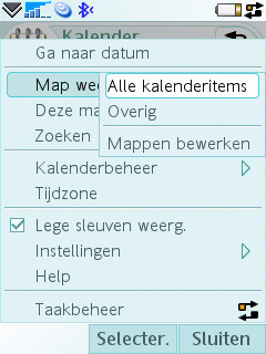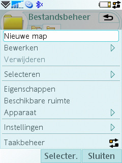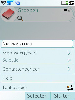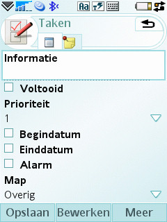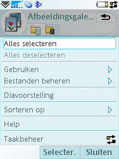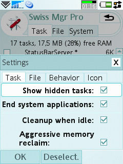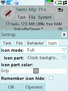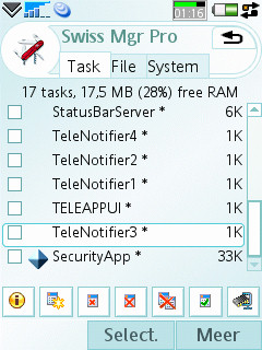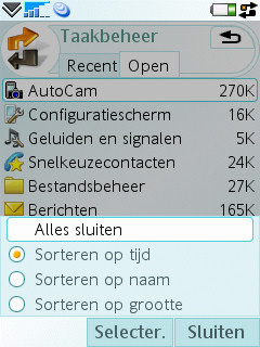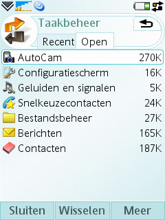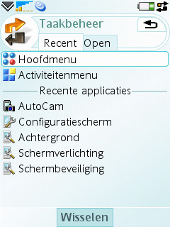 Het tweede punt is de nieuwe taskmanager die rechts bovenaan geselecteerd kan worden. Twee kleine pijltjes geven de taskmanager weer. De nieuwe taskmanager in het toestel is een simpele versie. Verwacht geen Sman mogelijkheden (add-on programma bekend van de P910i). Als gebruiker is het mogelijk om een lijst op te vragen van taken en deze opnieuw te starten of te sluiten. Men kan switchen tussen taken en dat is het dan. Het automatische afsluiten van applicaties is er niet bij. Men kan daarvoor de nieuwe applicatie Swiss Manager gebruiken. In het onderdeel Extra zal dit programma verder worden besproken.