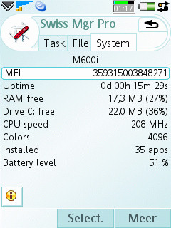 Om de Sony Ericsson M600i fatsoenlijk te laten draaien is het aan te raden om Swiss Manager te installeren. Deze gratis applicatie die momenteel nog doorontwikkeld wordt geeft de gebruiker de mogelijkheid om applicaties af te sluiten. Hiermee kan men eenvoudig geheugen en batterijtijd besparen. Ook is het mogelijk informatie over het toestel op te vragen en is er een zeer uitgebreide file manager aanwezig. Op de afbeeldingen is de nieuwe Swiss Manager Pro zichtbaar, een uitgebreide versie van de normale Swiss Manager. Nog meer mogelijkheden, maar helaas niet gratis.