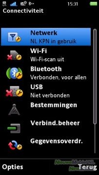 Het connectiviteitsmenu kan snel geopend worden met de snelkoppeling op de statusbalk. Hier zijn alle instellingen voor netwerk, WiFi, Bluetooth en USB te wijzigen. WiFi en Bluetooth verbindingen zijn makkelijk en snel gemaakt. Gegevens verzenden of ontvangen via Bluetooth gaat probleemloos. Met een bekend WiFi-netwerk wordt automatisch verbinding gemaakt. Het lijkt onmogelijk om WiFi helemaal uit te zetten als een bekend netwerk binnen bereik is. Na verloop van tijd heeft het toestel gewoon weer verbinding gemaakt met WiFi. Bij een USB-verbinding kan gekozen worden uit PC suite, mediaoverdracht, massasopslag en afdrukken.