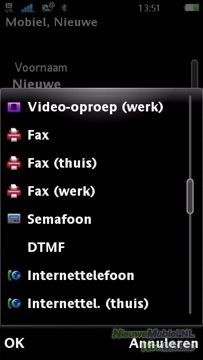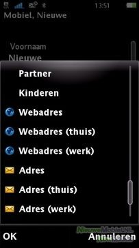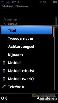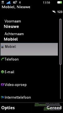 Voor een nieuw contact kunnen ontzettend veel gegevens opgeslagen worden. Standaard zijn dit voor- en achternaam, mobiel en vast telefoonnummer, e-mail, video-oproep, internettelefoon, push to talk, bedrijf, functie en synchronisatie. Via opties kunnen daar onder andere nog meer telefoonnummers, e-mailadressen, adresgegevens en verjaardagen aan toegevoegd worden.