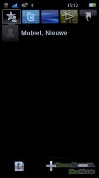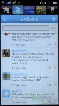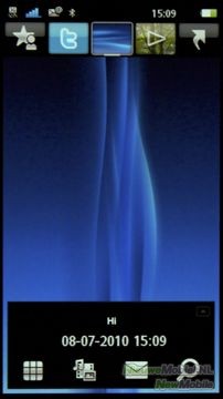 Er kan voor elk scherm uit acht opties gekozen worden. Dit zijn een flow-animatie, wallpaper, een op flash gebaseerd spel waarbij ballonnen kapot moeten worden geprikt, acht snelkoppelingen naar programma’s, twitter, camera-album of favoriete contactpersonen. Switchen tussen de startschermen kan door horizontaal over het scherm te slepen, of miniaturen van de schermen boven in beeld aan te raken. Van de twitterfunctie moet niet teveel verwacht worden want het geeft maar 20 tweets weer en kan verder alleen gebruikt worden om je status te updaten.