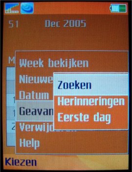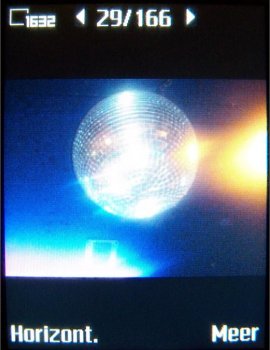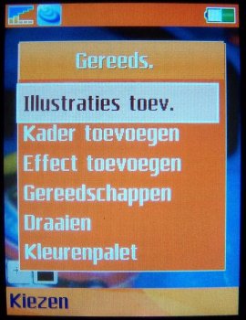 Verdere instellingen in de camera zijn de 4x zoom die men via een toets naast de camera (op)neemtoets kan instellen per stappen van 0.1 zoom, de helderheid die ingesteld wordt door de bedieningstoets naar links of rechts te verplaatsen, de foto modus (normaal, panaroma, kaders en burst), fotoformaat (Groot 1632 x 1224, Gemiddeld 640 x 480 en Klein 160 x 120 pixels), zelftimer, effecten (Zwart-Wit, Negatief, Sepia en Solariseren), Witbalans (Auto, Daglicht, Bewolkt, TL-licht en Fel licht), Fotokwaliteit (Normaal en Fijn), Tijd- en datumnotatie, Reset bestandsnummer en het gekozen opslagmedium, dus geheugenkaart of intern geheugen. Dit is alles is nog niet zo uitgebreid qua opties als de Samsung D600 of E730, maar men komt een eind in de buurt.