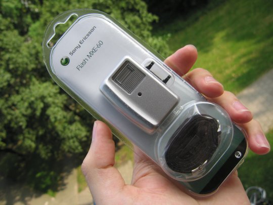 De optionele MXE-60 flitser komt tegemoet aan de grootste tekortkoming van alle cameratelefoons: het is een flitser met een echte flitsbuis. Daar waar de ingebouwde flitser van een telefoon niet meer is dan een witte LED, is de MXE-60 een heuse flitser met alle mogelijkheden die we van een gewone elektronenflitser kennen. Eenmaal op het toestel geklikt verschijnt kortstondig de melding op het scherm dat de flitser geplaatst is. Vervolgens kan via het fotocamera menu de werking ingesteld worden. Met de MXE-60 op het toestel geplaatst, neemt het flits bereik tot zo'n drie meter. Uiteraard heeft de flitser na elke flits enkele seconden nodig om weer op te laden. Met recht is deze flitser een accessoire die de telefoon compleet maakt. Jammer is echter dat de kleurstelling, zilver grijs, niet echt past bij die van de telefoon. Alleen de zilveren K750i vormt qua kleur een perfect geheel met deze add-on.