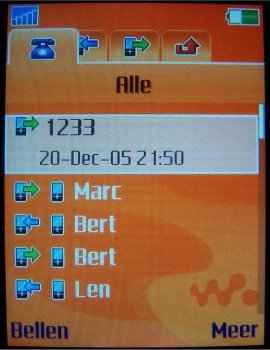 Vanuit de stand-by stand geeft de linker softkey (Gesprek) toegang tot het complete gespreksoverzicht. Uit dit scherm blijkt duidelijk de aangepaste gebruikersinterface waarbij tabbladen worden gebruikt. Het gebruik van dergelijke tabbladen is niet nieuw; in oudere Ericsson modellen kwamen ze ook al voor. Het gespreksoverzicht bestaat uit vier bladen: Alle, Uitgaand, Beantwoord en Gemist. Alle gesprekken die met de W900i zijn gevoerd worden hier gerubriceerd weergegeven. Overige gegevens met betrekking tot gesprekken zijn terug te vinden onder het icoon Instellingen op het tabblad Gesprekken. Hier zijn diverse tellers geplaatst; naast duur en kosten van de gesprekken worden hier het aantal verzonden SMS- en MMS-berichten en de hoeveelheid ontvangen data geregistreerd. Alle tellers zijn uiteraard op nul te stellen, individueel en allen gelijktijdig.