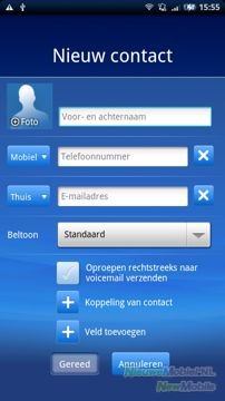 Een nieuw contact kan alleen opgeslagen worden in de telefoon en vervolgens kan een back-up van de contactenlijst worden gemaakt op de SIM-kaart of geheugenkaart. Voor een nieuw contact kan in eerste instantie een foto, voor- en achternaam, telefoonnummer, e-mail en beltoon worden ingevoerd. Door velden toe te voegen kunnen nog meer telefoonnummers, e-mailadressen, chatgegevens, postadressen en overige informatie worden toegevoegd. Contacten kunnen gesynchroniseerd worden met Google of met Sony Ericsson sync.