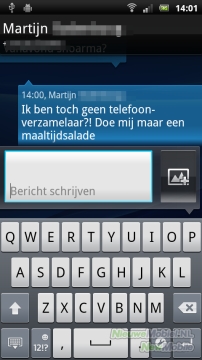 Het versturen en ontvangen van berichten vormt geen enkel probleem. Het invoeren van tekst kan zowel in horizontale als verticale ligging van de telefoon. Je kunt daarbij zelf kiezen om met een QWERTY-toetsenbord te werken, of met een toetsenblok. Automatische spellingverbetering is aanwezig op de Xperia ray. Wel zo makkelijk, want op het kleine scherm wil er nog wel eens een foutje insluipen bij het typen. Bijlagen zijn eenvoudig toe te voegen door middel van een sneltoets. Hiermee wordt een SMS automatisch tot een MMS gepromoveerd. Berichten worden overigens in conversaties beheerd.