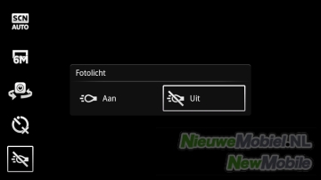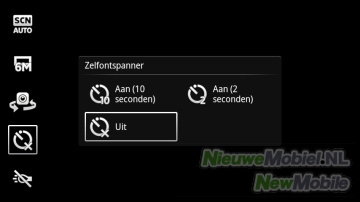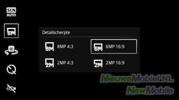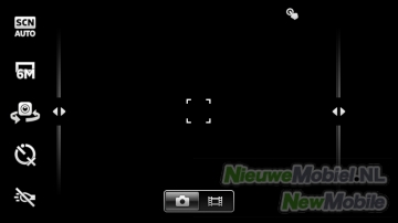 In het camerascherm zijn snelkoppelingen naar de opnamemodus (normaal, glimlachdetectie of automatisch), detailscherpte (2, 6 of 8 MP), frontcamera, scènes (o.a. liggend, sport en strand), flitser, en het foto-album. Rechts in het scherm worden miniatuurweergaven getoond van je laatst gemaakte opnamen. Verder zijn via de menu-knop de zelfontspanner, focusmodus, lichtwaarde, witbalans, lichtmeting, beeldstabilisator, geolabels en sluitergeluid te bepalen.