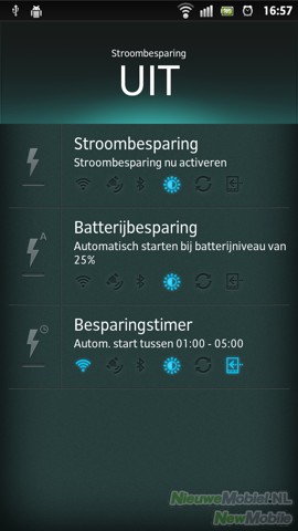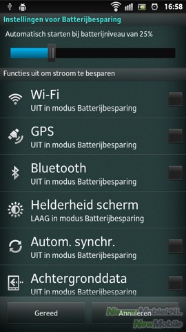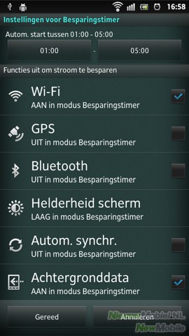 Je kunt dat zo instellen dat een vooraf ingesteld profiel geactiveerd wordt zodra de batterij minder is dan een tevens zelf in te stellen limiet. Zet bijvoorbeeld WiFi, GPS en automatisch synchroniseren uit als de batterij nog 25% vol is. Hiernaast is ook een gepaalde periode te selecteren waarin een profiel actief moet worden. Zo kun je 's avonds bijvoorbeeld bepaalde zaken uitschakelen die je in je slaap toch niet nodig hebt. Handig en slim van Sony die het ontbreken van de "automatisch helderheid"-optie goed compenseren.