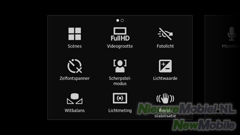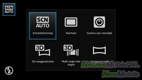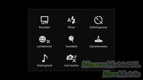 Verdere instellingen zijn scèneherkenning, 3D-veegpanorama, resolutie (12MP 4:3, 9MP 16:9, 2MP 4:3 en 2MP 16:9), flitser (automatisch, opvul, rode-ogenreductie en uit), zelfontspanner, geolabels, opnamemodus (knop op scherm, vastleggen met aanraken en alleen cameratoets), sluitergeluid en snelstarten. Via die laatste optie kun je door de cameratoets ingedrukt te houden vanuit standby direct een foto schieten. Handig om geen moment te hoeven missen.